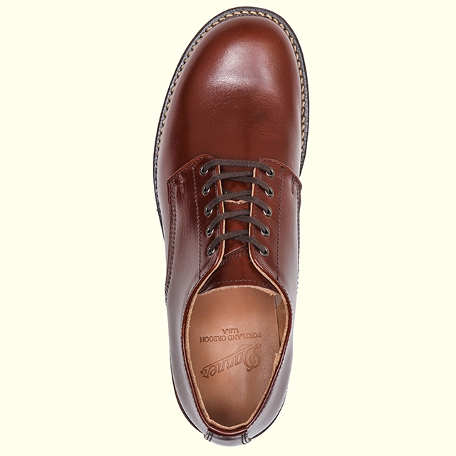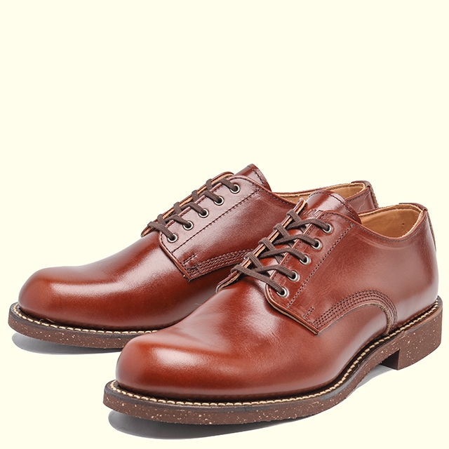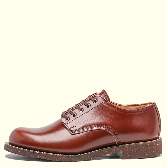 ヴィンテージのミリタリー・ラストをモディファイ。外羽のプレーントゥ、小径の5個アイレットといったディティールを、イタリア・トスカーナのレザーで表現。