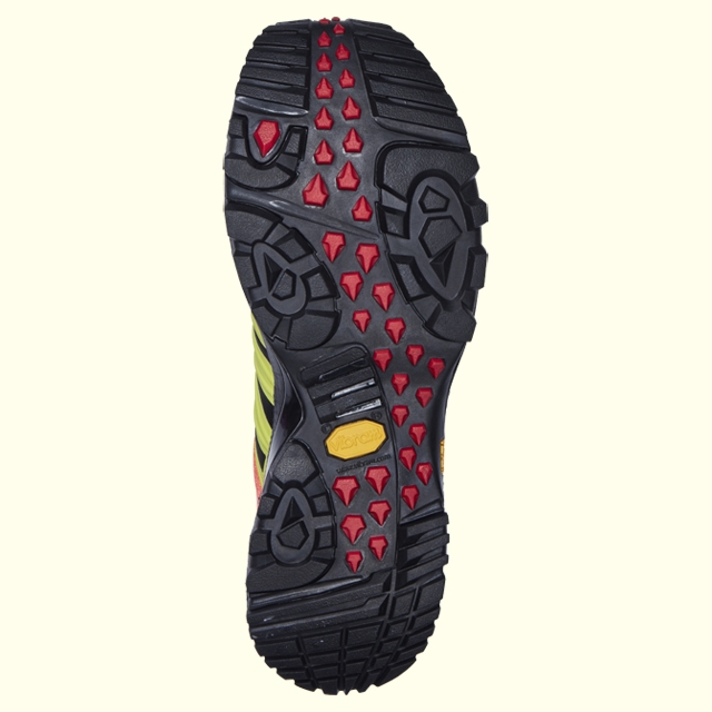 アウトソールはvibram FASTER のレイヤーソールを採用。高レベルのグリップ力とトラクションに加え、土踏まず部に配置されてTPU スタビライザーが ブレない着地をサポートする。"