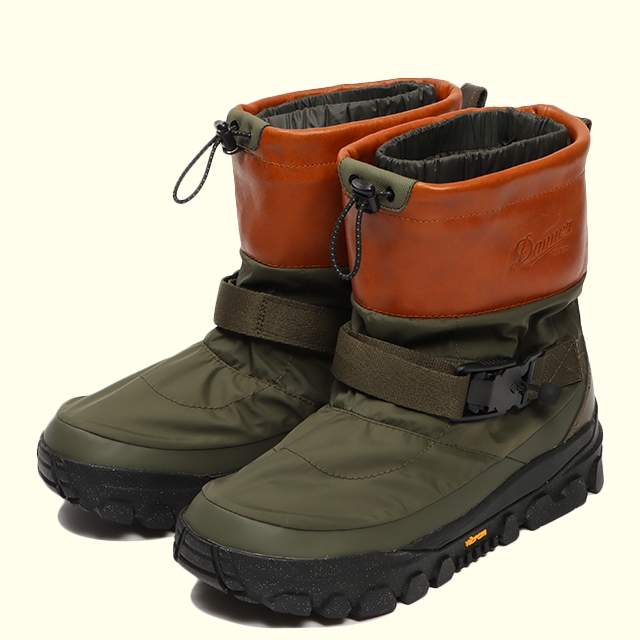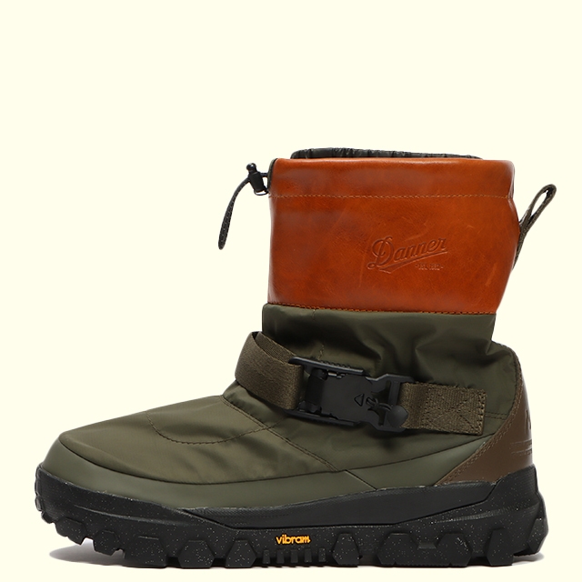 アイストレック配合された底面はアーバンシーンはもちろん寒冷地でも強力なグリップを発揮します。 インナーブーツはホワイトダックダウンを使用。インナーブーツのみでテントシューズとしての使用も可能です。ブーツシャフト上部にダナーらしくレザーを使用。ナイロンとレザーの異素材コンビネーションが特徴的でレザー部はエイジングを楽しめる新しい形のダウンブーツとなっています。