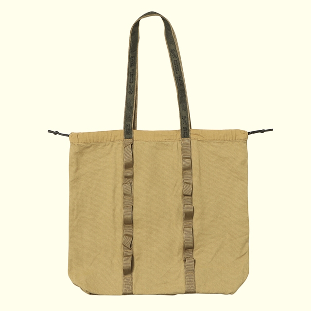 製品洗い加工を施したコットンキャンバス素材の人気定番型トートバッグ12ozのコットンキャンバスに異なる素材感のテープを合わせました。 製品洗いを施す事でコットン特有の適度なエイジング感を加えました。