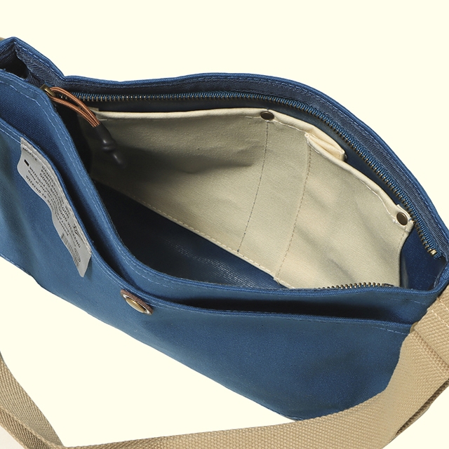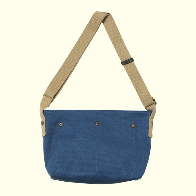 シンプルでクラシカルなデザインのコットン製ショルダーバッグ12ozのコットンキャンバスの裏面にラミネートコーティングを施しカバンが自立するようにコシを持たせました。