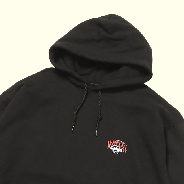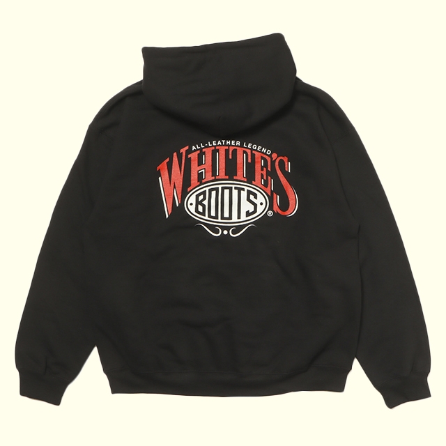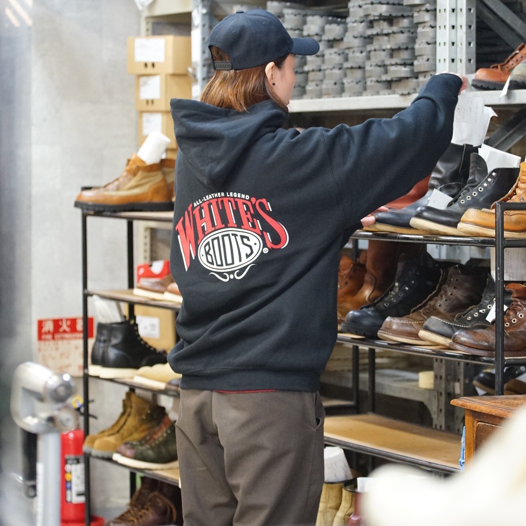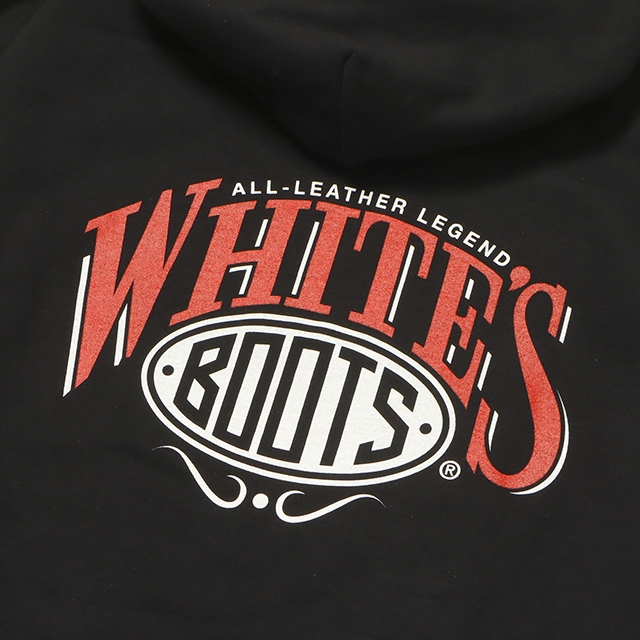 アメリカンブーツの名門WHITES' BOOTSの象徴的なロゴを背面に大胆にプリントした、本格裏起毛フーディー。