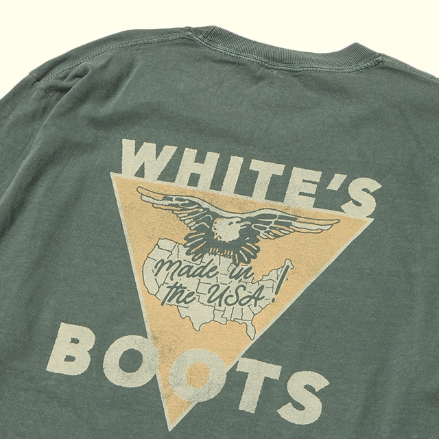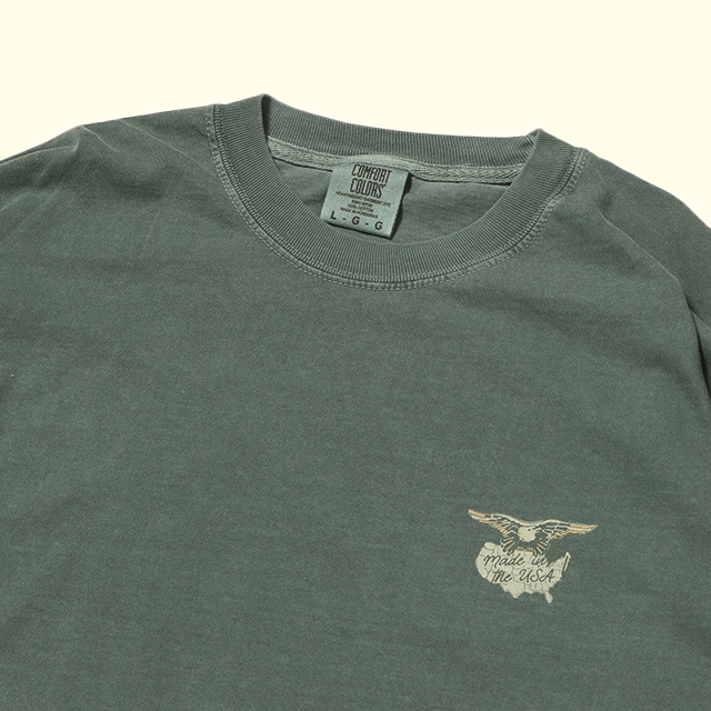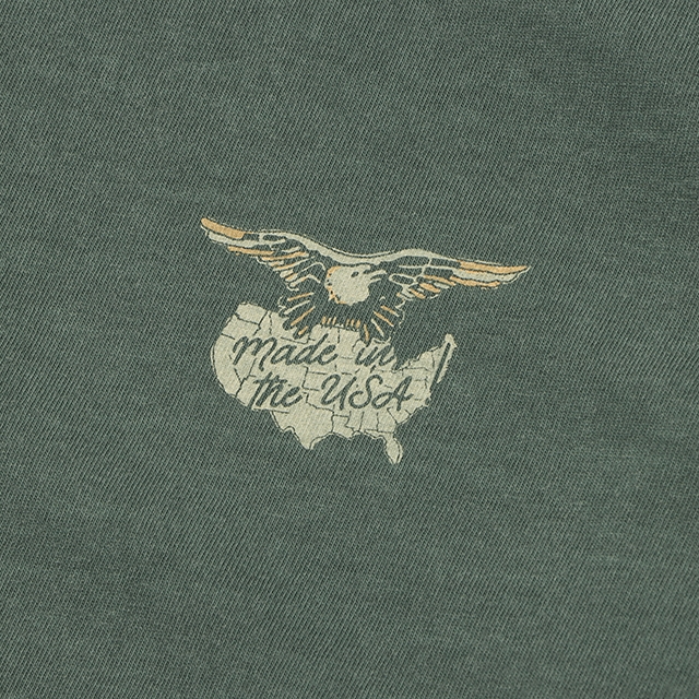 ボディにはピグメント加工(顔料染め)【※BLACKは直接反応染め】を施したUSED感のある表情のヘビーオンスを使用し、背面にはカスレ感のあるEAGLEのARTWORKをプリントしたSS TEE。
