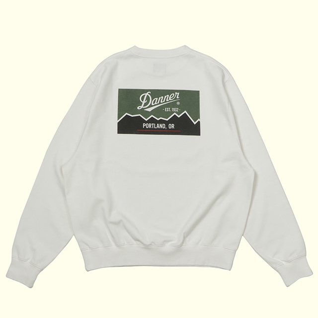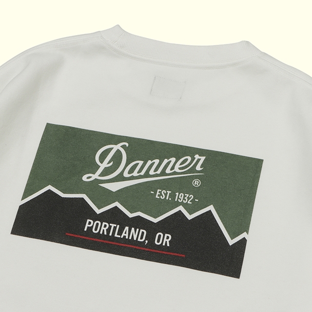 Dannerのオリジナル柄(Mt.Foot)のプリントを施した、製品顔料染めのCREW NECK SWEATの製品です。