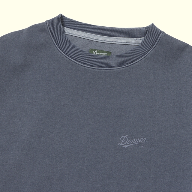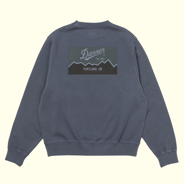Dannerのオリジナル柄(Mt.Foot)のプリントを施した、製品顔料染めのCREW NECK SWEATの製品です。